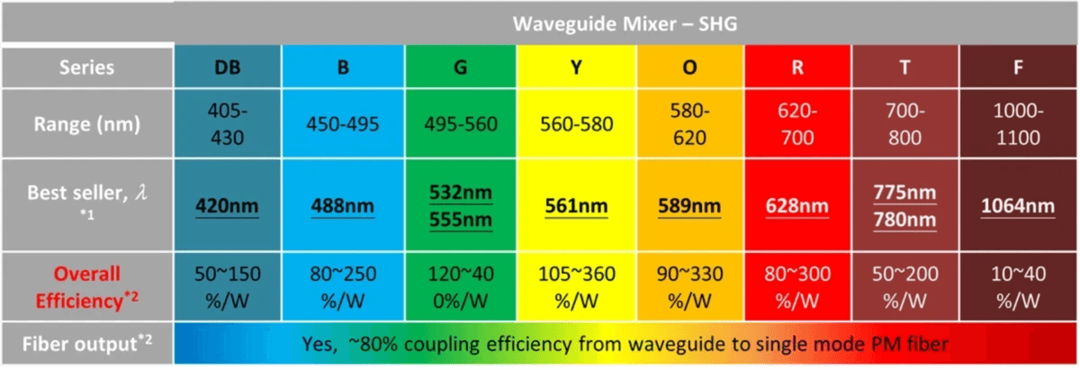 - Mixing configurations: SHG, SFG, DFG, Cascaded SHG-SFG (THG), Tunable, etc.